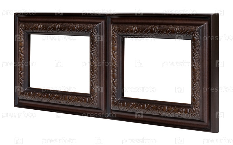 Двойная деревянная рама (диптих) для картин, зеркал или фотографий в перспективе, изолированных на белом фоне. Элемент дизайна с обтравочным контуром