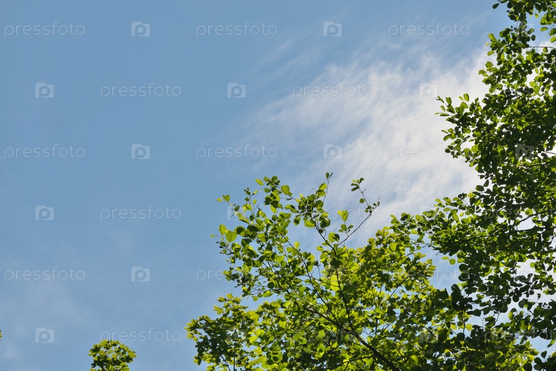 Зеленая дубовая листва на фоне голубого неба с облаками. Изолированный фон