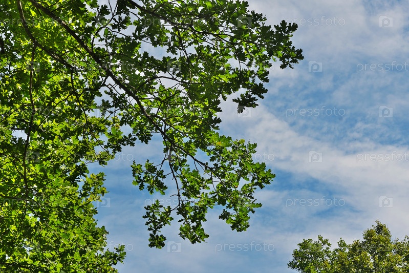 Зеленая дубовая листва на фоне голубого неба с облаками. Изолированный фон
