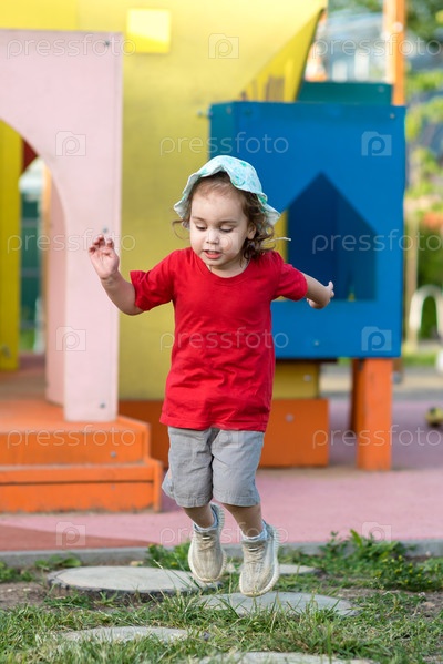 Маленькая счастливая девочка прыгает на детской площадке летом