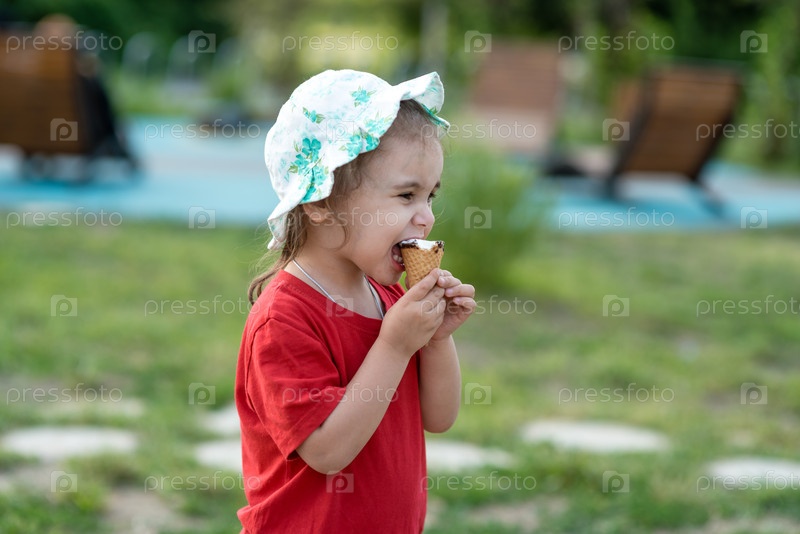 Маленькая девочка ест мороженое в парке летом. Портрет ребенка крупным планом