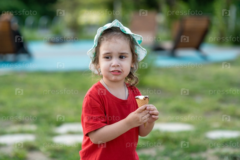 Маленькая девочка ест мороженое в парке летом. Портрет ребенка крупным планом