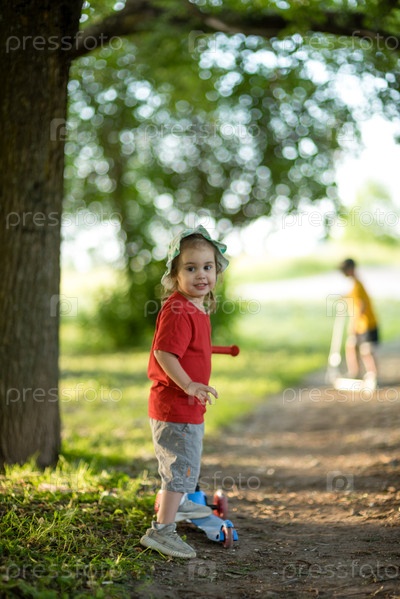 Маленькая девочка и мальчик гуляют одни в парке