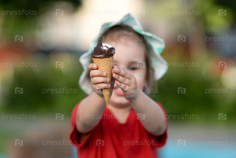 Маленькая девочка держит мороженое в руке - фокус на мороженом и размытом фоне