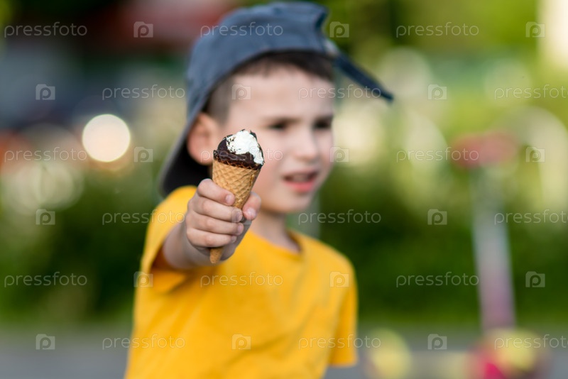Маленький мальчик держит мороженое в руке - внимание на мороженом