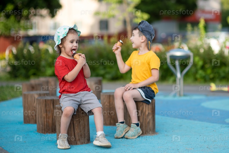 Маленькие дети, мальчик и девочка, едят мороженое летом на детской площадке