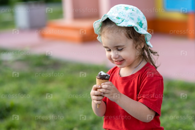 Маленькая девочка ест мороженое летом на детской площадке