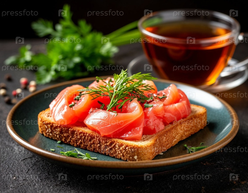 Тост с красной рыбой, зеленью и чашкой чая. Сгенерировано с помощью ИИ