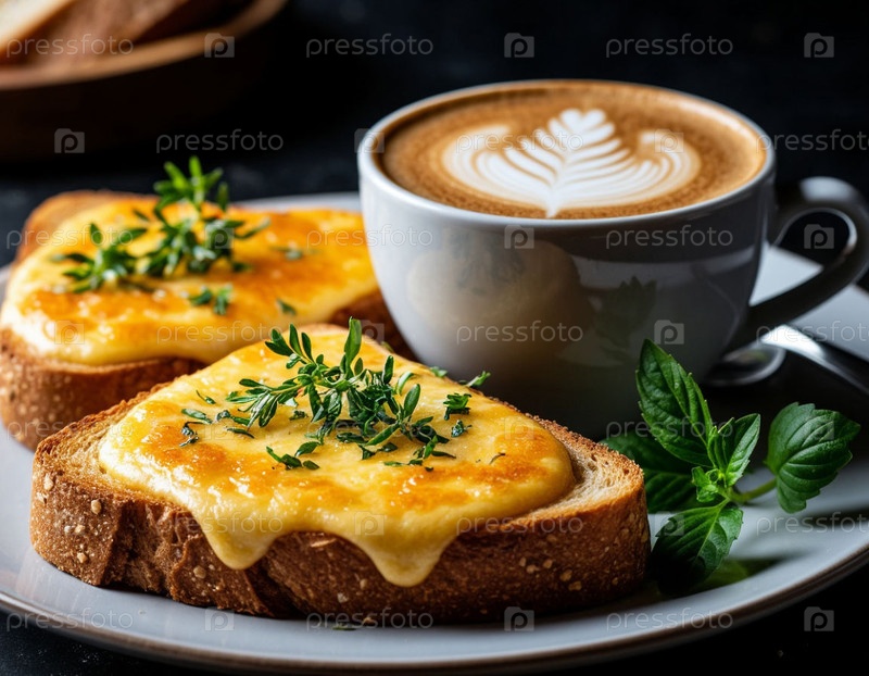 Тост с сыром и капучино на завтрак. Сгенерировано с помощью ИИ