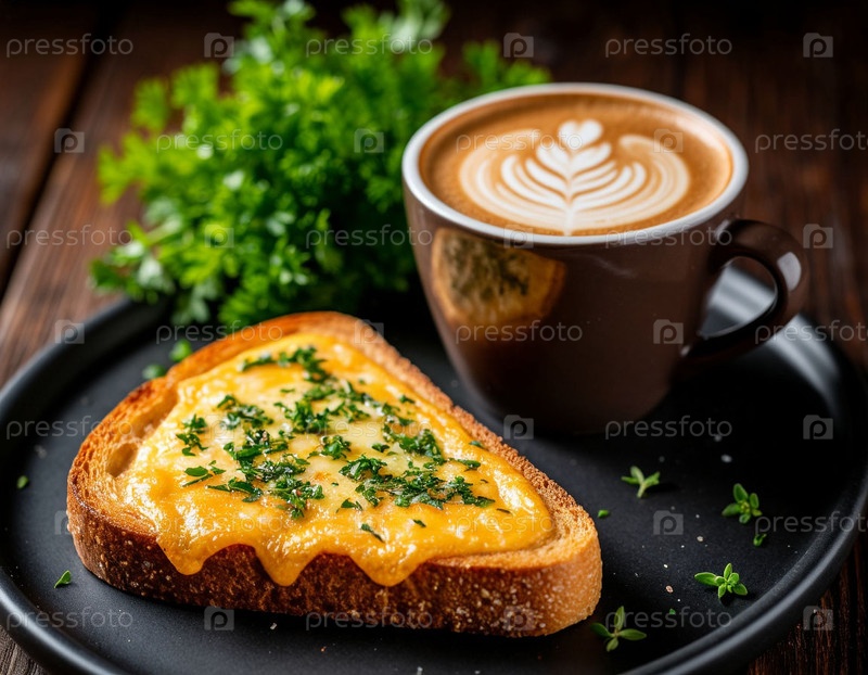 Тост с сыром и капучино на завтрак. Сгенерировано с помощью ИИ