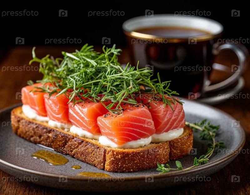 Тост с красной рыбой, зеленью и чашкой чая. Сгенерировано с помощью ИИ