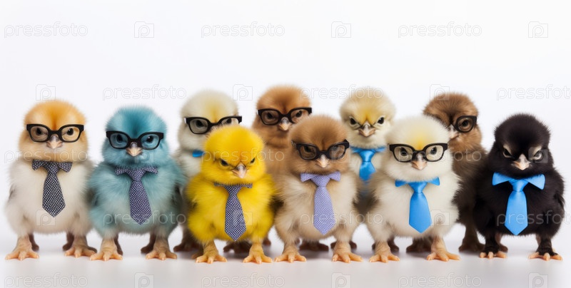 Панорама множества молодых пушистых пасхальных цыплят, стоящих на белом фоне
