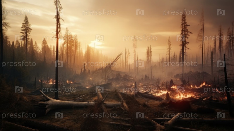 Пожар охватывает лес и сухую траву, оставляя на земле черный слой гари и пепла