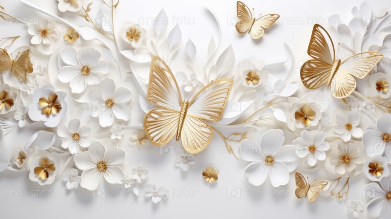 Ветка белого растения с весенними цветами и золотыми бабочками для легкого, светлого фона