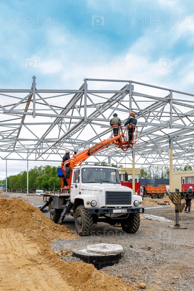 Рабочие на большой высоте работают над сборкой новых навесов на строительной площадке