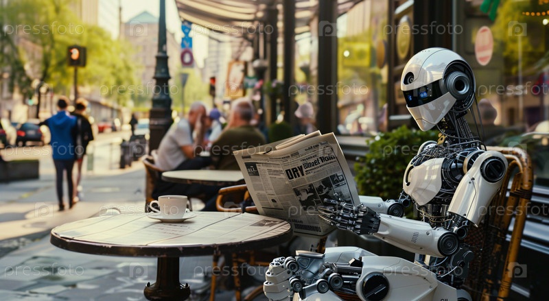 Робот сидит за столиком уличного кафе, читает газету и наслаждается чашкой кофе в спокойной обстановке