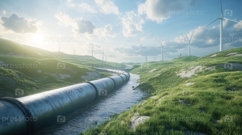 Возрождение энергетики в зеленом ландшафте с ветряными турбинами и трубопроводами под солнечным небом