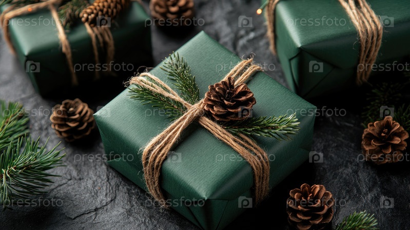 Красиво упакованные зеленые подарки с шишками и еловыми ветками