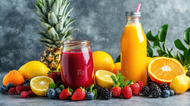 Яркая экспозиция разноцветных фруктовых соков в бутылках, окруженных свежими фруктами и листьями мяты