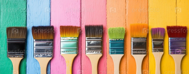 Ряд кистей для рисования, выстроенных на ярко расписанном деревянном фоне, демонстрирует спектр цветов и текстур