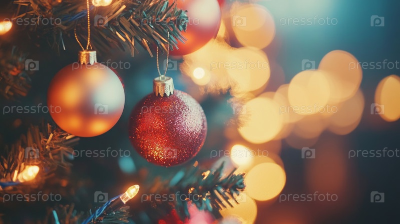Красиво украшенная рождественская елка с разноцветными игрушками и падающими снежинками создает праздничное и радостное предпраздничное настроение