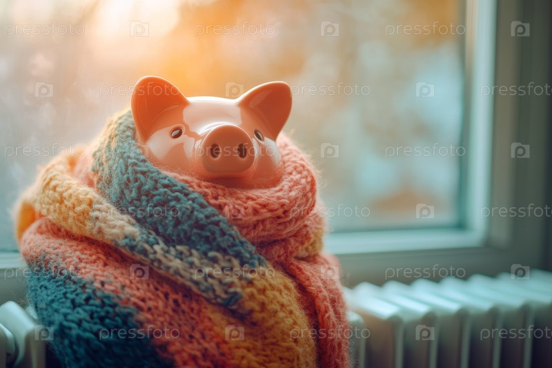 Милый поросенок в уютном шарфе сидит на подоконнике, впитывая тепло солнечного света. Вязаный шарф уютно обнимает улыбающегося поросенка у окна