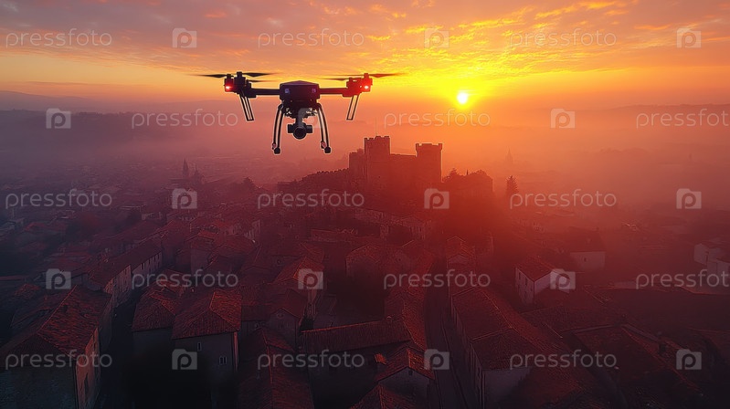 Величественный закат над древним замком с видом с дрона
