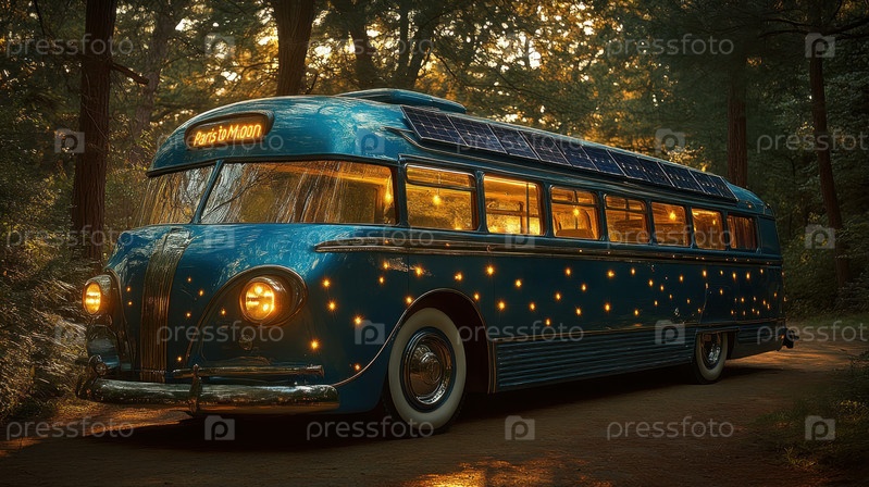 Ржавый старинный автобус с надписью «Из Парижа на Луну» ночью