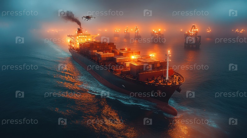 Дроны сопровождают грузовое судно на закате в футуристической сцене