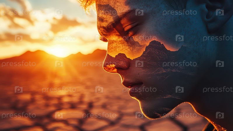 Двойная экспозиция лица мужчины и заката в горах