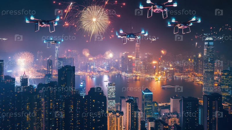 Дроны и фейерверки над современным городским горизонтом в сумерках
