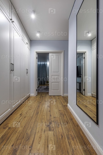 Современная прихожая с белыми шкафами и деревянным полом