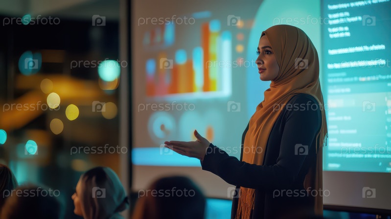 Мусульманская бизнес-леди проводит презентацию с графиками