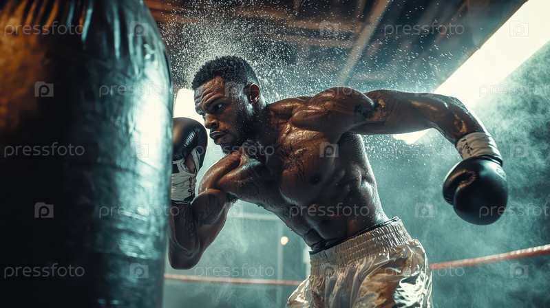 Мускулистый боксер усиленно тренируется, нанося мощные удары по тяжелому мешку, создавая мощную энергетику в тускло освещенном спортзале