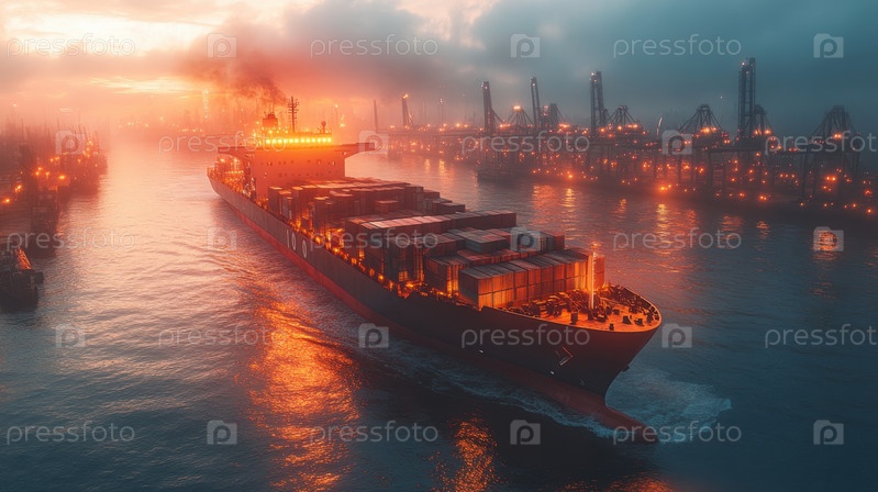 Дроны сопровождают грузовое судно на закате в футуристической сцене