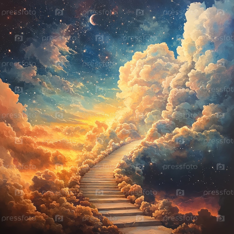 Лестница, ведущая сквозь облака к сияющему свету в небе. Путь на небеса