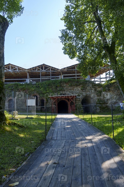 Исторический каменный вход в крепость с деревянной дорожкой и деревьями