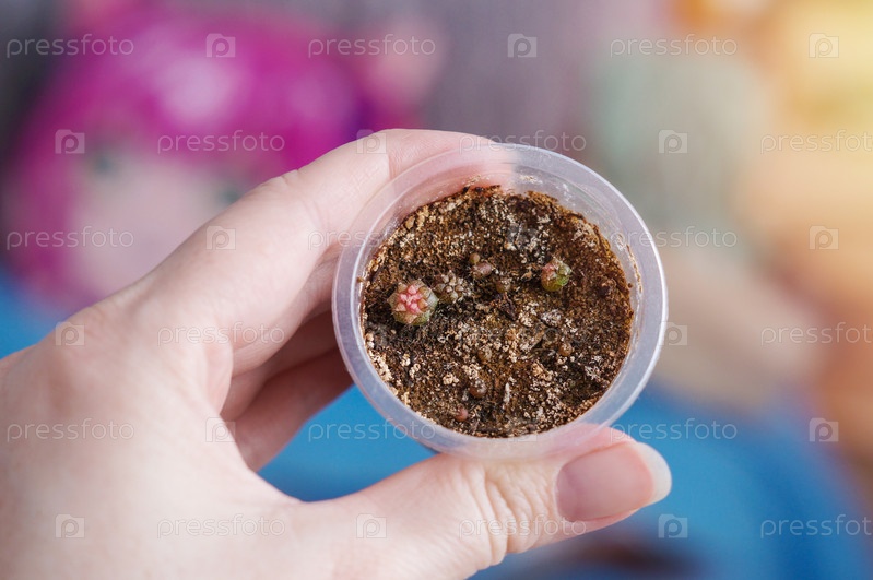 Рассада кактуса Гимнокалициум Gymnocalycium Variegata из семян в женской руке