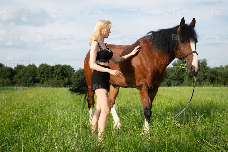 Молодая красивая женщина с белыми волосами позирует на зеленом поле с лошадью