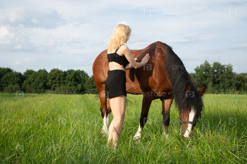 Молодая красивая женщина с белыми волосами позирует на зеленом поле с лошадью