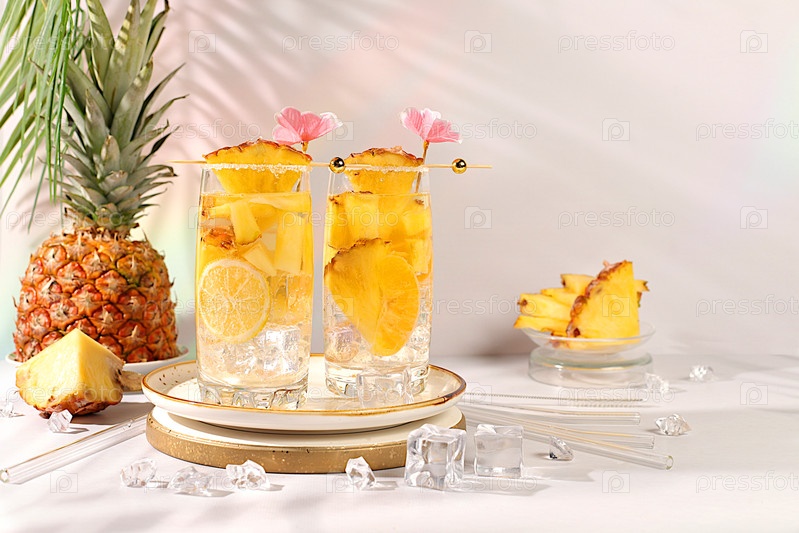 Различные коктейли с кусочками манго, ананаса и льда в стаканах с ободками и зонтиками. Концепция тропической вечеринки и релаксации. Рекламная визитная карточка для меню бара и ресторана