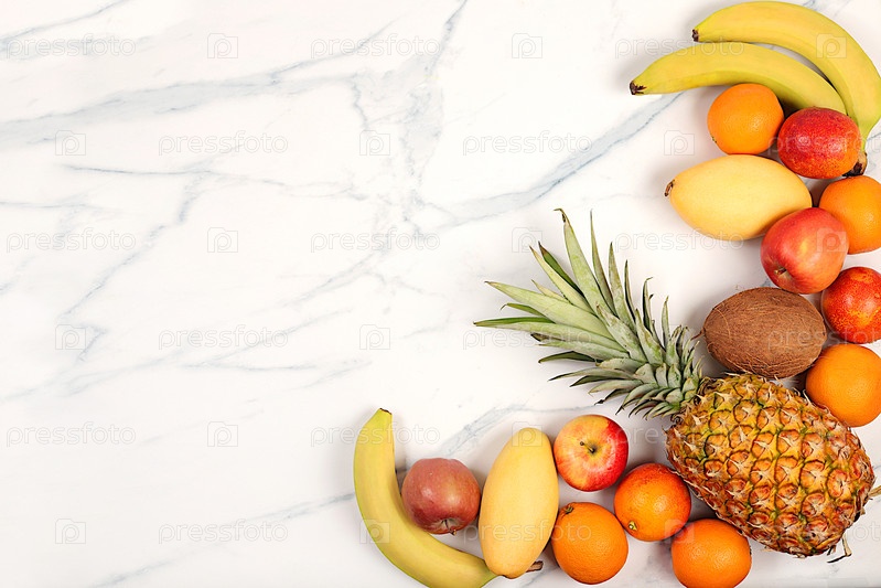Детокс диета и концепция потери веса. Летние тропические фрукты на мраморном столе, источник витамина С, баннер магазина, здоровые веганские продукты для здорового образа жизни, реклама магазина