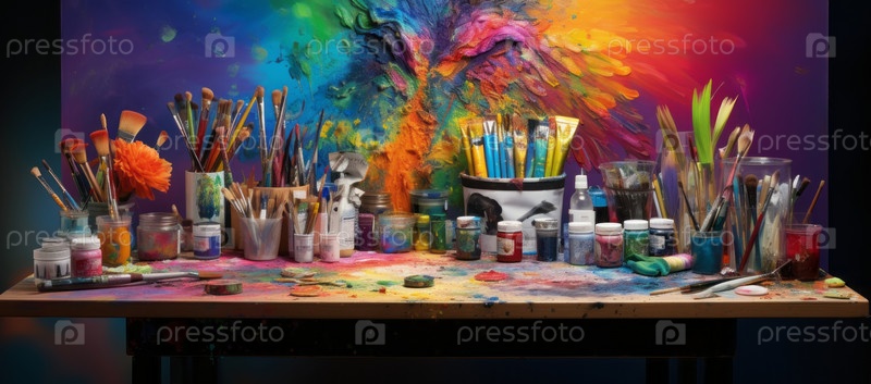 Изображение набора художественных принадлежностей, включающего цветные карандаши, краски, кисти и альбом для рисования