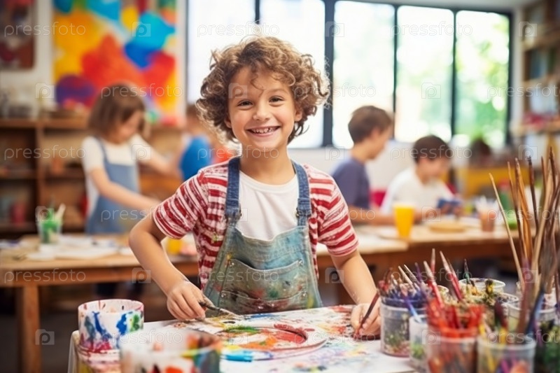 Европейский мальчик со счастливой улыбкой на уроке искусства и творчества в начальной школе
