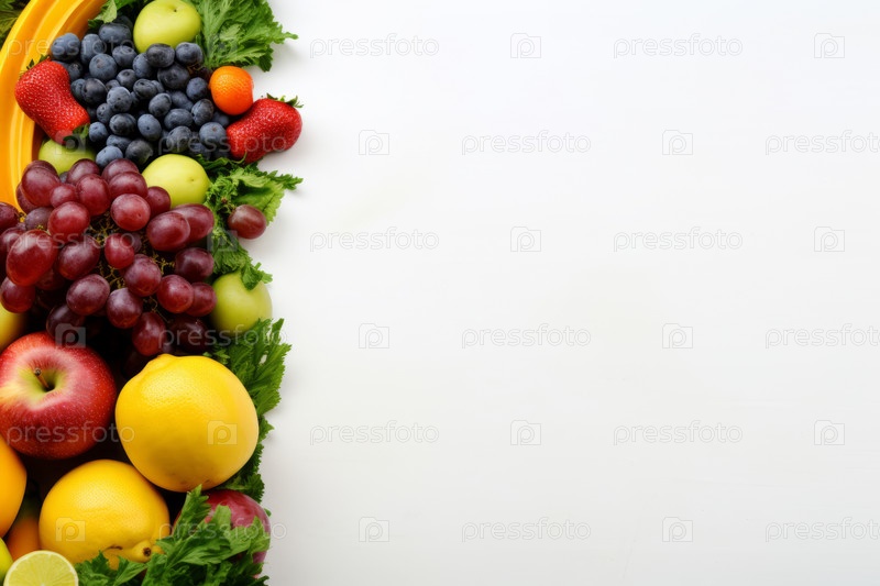 Композиция из фруктов и овощей, изолированных на белом фоне. Красивая широкая рамка со свободным пространством для текста. Коллаж