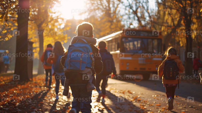 Дети бегут к школьному автобусу осенним утром с рюкзаками