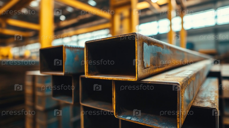 Штабеля квадратных и прямоугольных стальных профилей аккуратно сложены на большом промышленном складе и готовы к использованию в строительных или производственных проектах