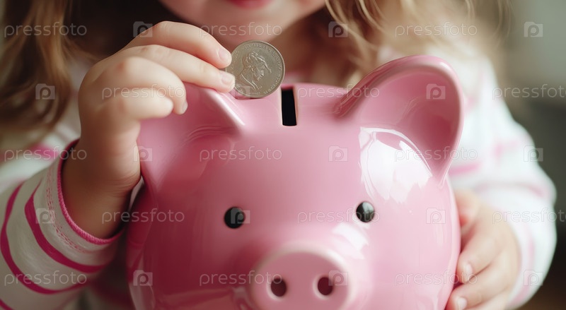 Ребенок держит розовую копилку и готовится опустить в нее монету, что символизирует важность сбережения денег с раннего возраста