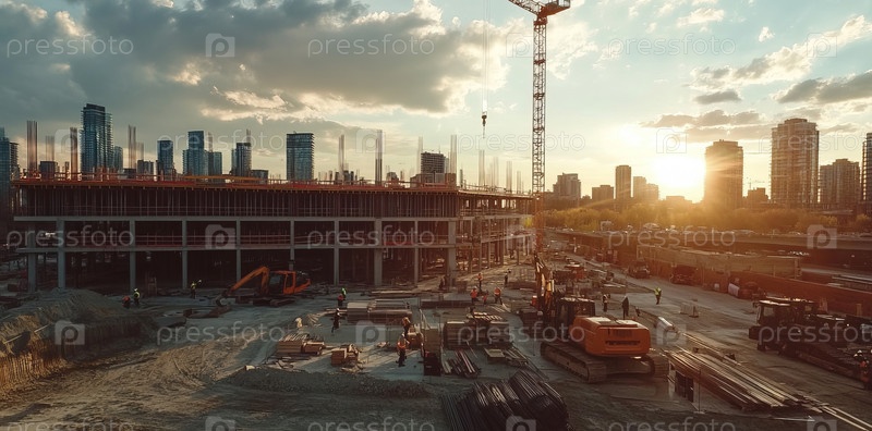 На строительной площадке кипит жизнь: краны и рабочие возводят новый небоскреб на фоне заката