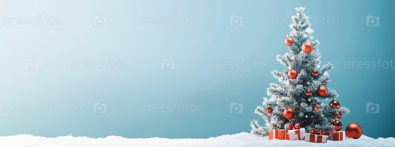 Покрытая снегом рождественская елка безмятежно возвышается на фоне огромного снежного пейзажа, украшенная игрушками и увенчанная сияющей звездой